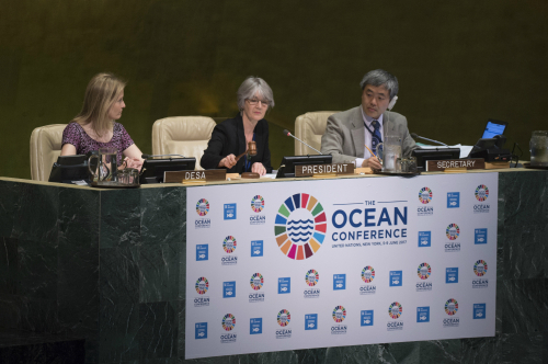 | 지난해 6월 미국 뉴욕의 유엔 본부에서 개최된 '오션 콘퍼런스'에서 사회를 맡은 로즈마리 패터슨(Rosemary Paterson) 뉴질랜드 외교부 장관 고문(가운데)이 개회를 선언하고 있다. |