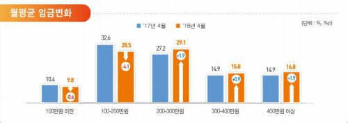 이날 통계청 관계자는 "100만~200만원 미만 비중이 4.1%포인트나 감소했다"며 "최저임금에 근로시간을 곱했을 때 (월 200만원) 경계선상에 있는 분들이 많았는데, 임금인상으로 이런 근로자들의 임금이 증가했다"고 밝혔다.