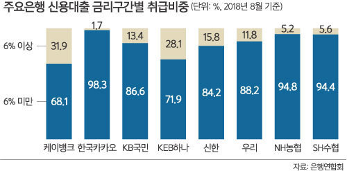 지난 8월 은행연합회에 고시된 ‘신용대출 금리구간별 취급비중’ 지표에 따르면 금리 6% 이상 대출 비중은 케이뱅크(31.9%), 하나은행(28.1%), 신한은행(15.8%), 국민은행(13.4%), 우리은행(11.8%) NH농협은행(5.2%) 등의 순이었다.
