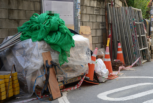 지난 24일 서울 용산구 한 공사현장. 공사용 자재들이 보행로를 점령해 안전을 위협하고 있었다. 용산구 한 초등학교 인근의 한 4층짜리 신축빌라 공사현장 앞 도로에는 시멘트와 벽돌 등 빌라 공사에 쓰이는 것으로 추정되는 자재들이 방치돼 있었다.