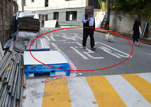 인근 빌라 공사 편의를 위해 쌓아둔 것으로 보이는 자재 탓에 시민들은 어쩔 수 없이 공사용 덤프트럭 사이로 지나다니며 아찔한 상황과 계속 맞닥뜨려야 했다. 심지어 이 도로는 초등학교 앞 어린이 보호구역이기도 하다. 어린이 안전 안전사고 우려는 물론 가로수까지 심각하게 해치고 있다는 지적이다.