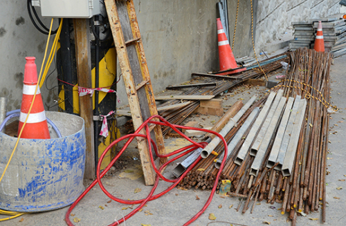 | 공사장 주변은 인도가 없어 차도 겸 보행로로 이용되는 실정. 건설자재들이 무분별하게 방치되고 있었다. |