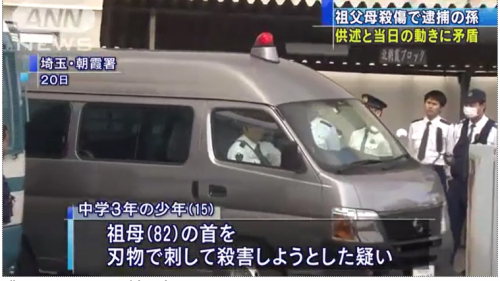 | 지난 18일 일본 사이타마현 와코시에서 흉기를 휘둘러 할아버지(87)를 살해하고 할머니(82)에게 중상을 입힌 중학교 3학년 손자(15)를 태운 경찰 차량이 이동하고 있다. 학교에서 이지메(왕따)를 당한 것으로 알려진 소년은 경찰에 “학교에 용서할 수 없는 학생이 있어서 죽일 계획이었다. 가족에 폐를 끼치기 때문에 먼저 가족을 전원 죽이려고 했다”는 취지의 진술을 했다. ANN 캡처 |