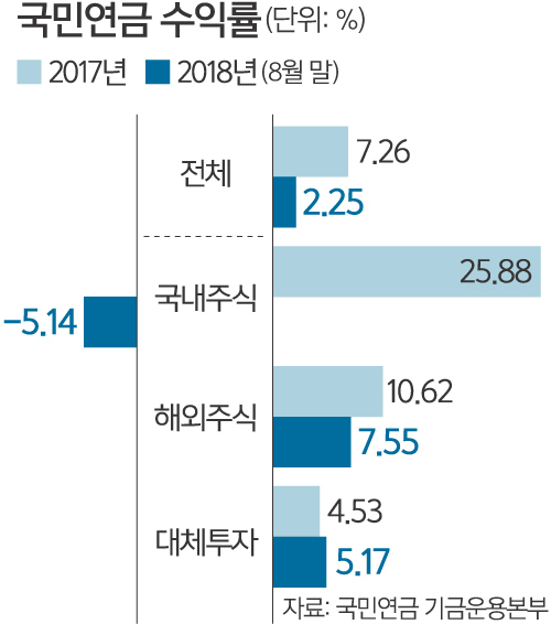 국민연금 기금운용본부는 “글로벌 주식시장이 활황이었던 지난해와 달리 올해는 미·중 무역분쟁, 통화 긴축, 부실 신흥국 신용위험 고조 등으로 국내와 글로벌 금융시장이 약세를 면치 못하면서 수익률에 부정적인 영향을 줬다”고 분석했다.