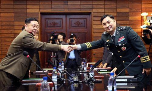 | 남북 장성급군사회담 남측 수석대표인 김도균 소장(오른쪽)과 북측 수석대표인 안익산 육군 중장이 지난달 26일 판문점 북측 통일각에서 회담에 앞서 악수하고 있다. 파주=사진공동취재단 |