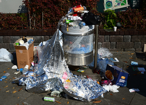 2018 한국시리즈 두산-SK 1차전 열린 4일 오후 서울 송파구 잠실구장. 경기장 인근 곳곳에는 분리되지 않은 쓰레기가 쌓여 있었다. 먹다 남은 치킨 조각부터 컵라면, 플라스틱 용기, 담배꽁초, 나무젓가락, 술병, 맥주 캔 등 각종 음식물 쓰레기가 뒤섞여 곳곳에 버려져 있다.