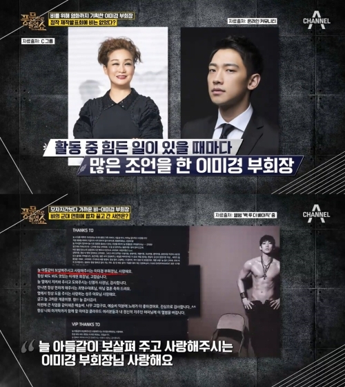 '풍문으로 들었쇼'에서 이미경 CJ그룹 부회장(맨 위 왼쪽 사진)과 비(〃 〃 오른쪽 사진)의 특별한 인연이 공개돼 화제다.