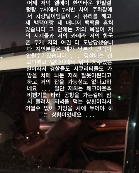 또 그는 "경찰에 신고했고 LA에서 워낙 자주 있는 일이라 경찰과 시큐리티 모두 가방을 차에 놔둔 저희 잘못이라 하며 잡을 가능성도 거의 없다고 하네요"라고 푸념을 털어놓았다.