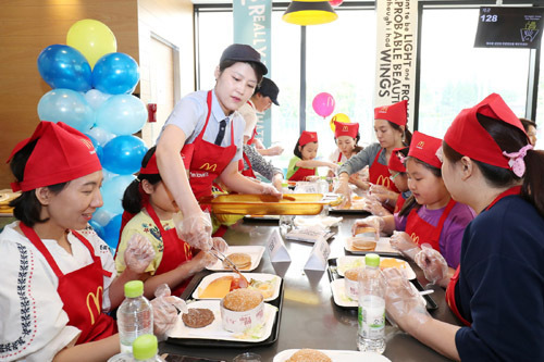 | 맥도날드가 정기적으로 진행하는 ‘버거만들기 쿠킹클래스’에 참가한 엄마와 아이들이 버거를 만들고 있다. 맥도날드 제공 |