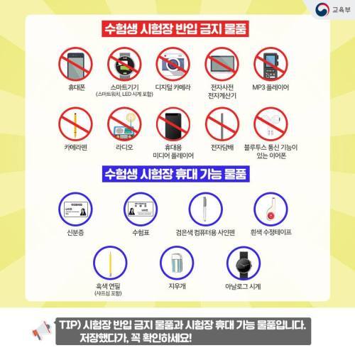 | 수험생 시험장 휴대 가능 물품과 금지품 |