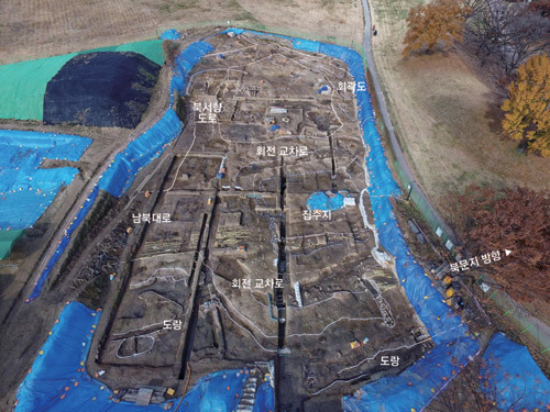 또 회전교차로 안쪽 공간에는 삼국시대에 만들어진 것으로 추정되는 사방 14규모 대형 집수지가 새롭게 확인됐다. 말머리뼈, 패각(조개껍데기), 복숭아씨 등 동·식물 유존체와 건축부재로 사용된 목재유물 등이 출토됐다.