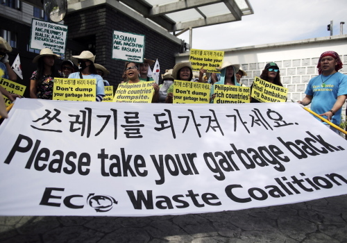 16일 현지 언론 등에 따르면 필리핀 환경단체 ‘친환경쓰레기 연합’ 회원 등 수십명은 전날 오전 주필리핀 한국대사관 앞에서 항의시위를 벌였다. 이들은 지난 7월 한국에서 불법으로 수입된 대규모 폐기물에 대해 한국어로 ‘쓰레기를 다시 가져 가세요’라고 적은 플래카드를 들고 항의했다. 이와 함께 한동만 주필리핀 한국대사에게 보낸 공개서한에서 “한국에서 수입된 수천t의 쓰레기가 신속하게 한국으로 돌아갈 수 있도록 조처해달라”고 요구했다.