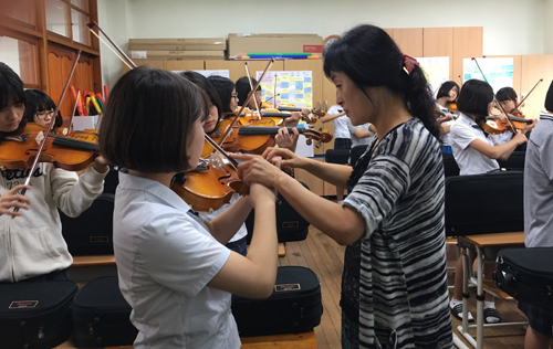 | 충남여중 학생들이 바이올린 수업을 받고 있는 모습. |