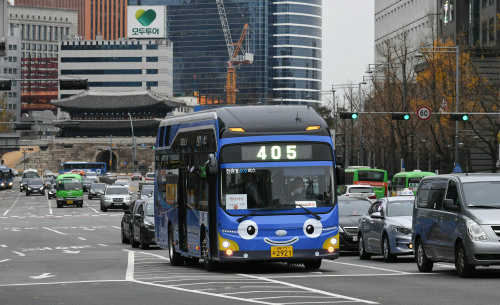 | 21일 오후 서울시 405번 버스노선에 시범 투입된 신형 수소전기버스가 시청광장 옆 도로를 달리고 있다. 남정탁 기자 |