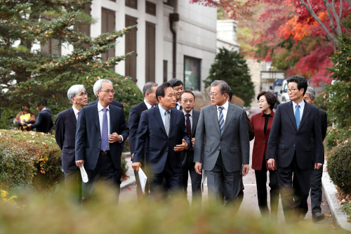 청와대 경내 산책하는 文대통령 입력 : 2018-11-21 19:16:19 수정 : 2018-11-21 19:16:19 구글 네이버 유튜브 문재인 대통령이 21일 오전 청와대 집현실에서 열린 ‘국정과제위원회 및 대통령자문위원회 오찬간담회’를 마친 뒤 참석자들과 경내를 산책하고 있다. 청와대사진기자단 Copyright ⓒ 세계일보. 무단 전재 및 재배포 금지 세계일보 박세준