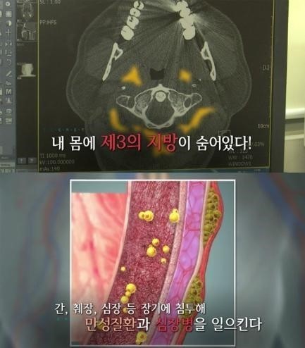 방송에서는 지방 조직에 있어야 할 지방이 간이나 근육, 심장, 췌장 등에 쌓이는데, 이를 이소성지방(제자리를 벗어난 지방)이라고 전했다.