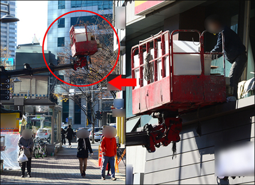 | 지난 12일 서울 용산구 효창공원역 인근. 한 건물에서 간판교체 작업이 진행되고 있다. 고소작업대는 보행자 머리 위로 쉴 새 없이 지나다니고 있다. |
