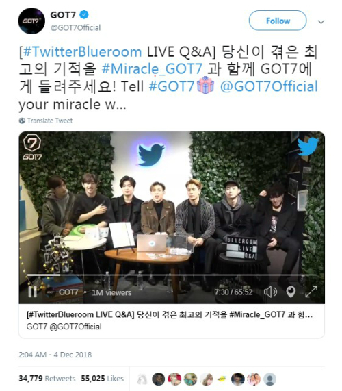갓세븐 공식 계정에서 확인할 수 있는 블루룸 라이브 Q&A 방송 트윗은 3만 4000건 이상의 리트윗과 5만 5000건 이상의 마음에 들어요, 150만 회에 달하는 누적 조회 수를 기록했다.