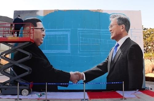 | 10일 오전 서울 종로구 청와대 앞 사랑채 광장에 문재인 대통령과 김정은 북한 국무위원장이 악수하는 모습을 그린 작품이 설치돼 눈길을 끌고 있다. 김경호 기자 |