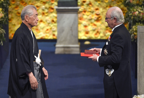 일본인 노벨상 수상자가 와후쿠를 입고 시상식에 참석한 것은 소설 설국(雪國)으로 유명한 가와바타 야스나리(川端康成)가 1968년 노벨문학상을 수상한 이래 50년 만이다. 노벨상 수상자는 연미복을 입고 시상식에 참석하는 게 관례다. 그동안 다른 노벨상 수상자도 연미복을 입고 수상했다.