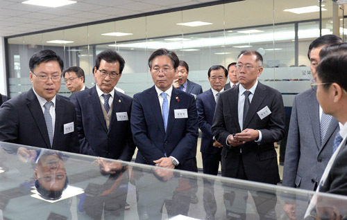 | 11일 현대모비스 충주 수소 연료전지시스템 생산공장에서 정의선 현대차그룹 수석총괄부회장, 성윤모 산업통상자원부 장관, 이시종 충북도지사(오른쪽부터) 등 정관계 인사와 현대차그룹 관계자들이 안병기 현대모비스 전동화사업부장(상무·왼쪽)의 설명을 듣고 있다. 현대차그룹 제공 |