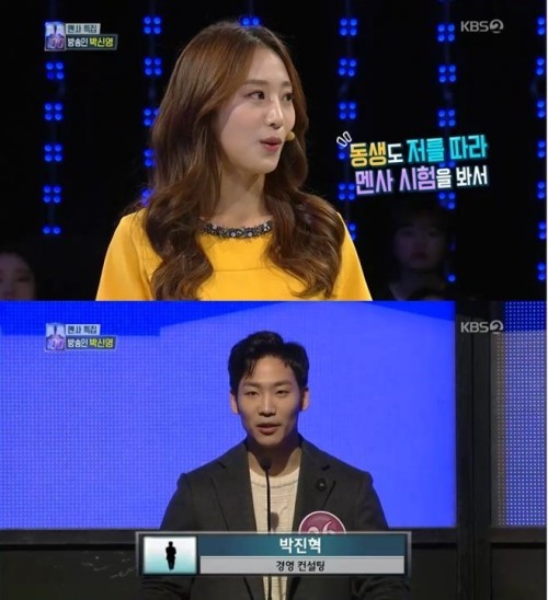 함께 출연한 남동생 진혁씨는 "외국계 기업 경영 컨설팀에 근무 중"이라면 "'누나가 멘사면 나도 멘사지' 그래서 의아해 하며 시험을 봤는데 다행히 1% 성적으로 합격을 했다"고 밝혔다.