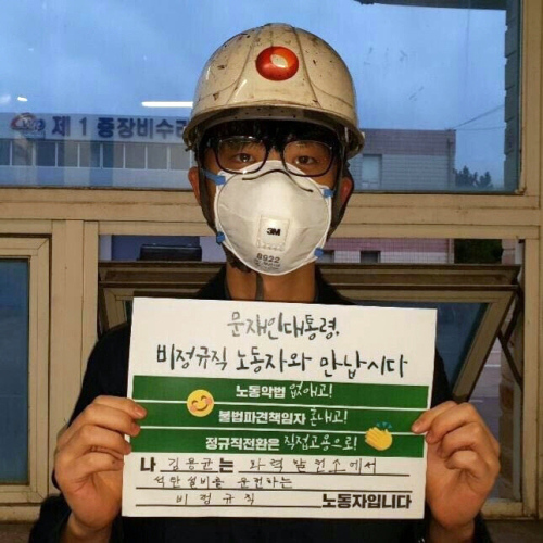 | 충남 태안화력발전소에서 운송설비점검을 하다 숨진 故 김용균씨가 지난 1일 비정규직의 직접고용을 요구하며 찍은 사진. 화력발전소 비정규직 대표 이태성씨 제공. |