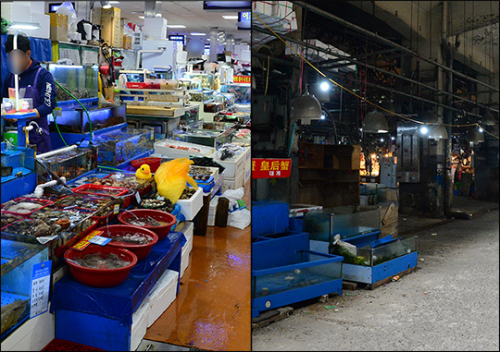| 서울 동작구 신 노량진수산물도매시장(왼쪽). 서울 동작구 구 노량진수산물도매시장.(오른쪽) 서울 동작구 노량진 수산시장은 상인들이 신축 건물 이전을 두고 '두집 살림'을 이어가고 있다. |