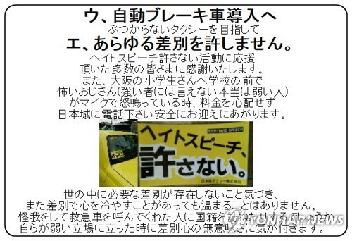 16일 교도통신에 따르면 오사카 스미노에(住之江)구를 거점으로 하는 니혼조(日本城)택시 소속 택시 60여대는 유리창에 '헤이트 스피치, 용인하지 않는다'고 적힌 스티커를 붙인 채 운행하고 있다.