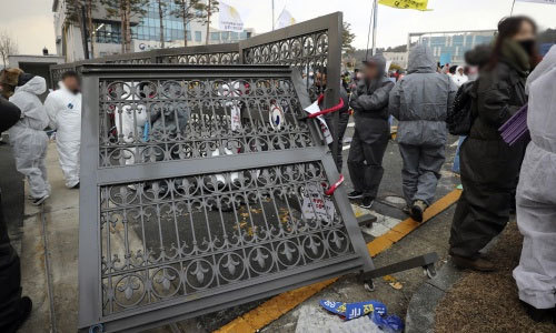 | 지난 13일 충북 청주시 식품의약품안전처 앞에서 열린 계란 산란일자 표기 반대 집회’에 참석한 양계 농가 농민들에 밀려 식약처 정문이 뜯겨 나갔다. 연합뉴스 |
