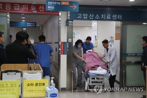| 지난 18일 강원 강릉시 경포의 한 펜션에서 수능시험을 끝낸 서울 대성고 3학년 남학생 10명 중 3명이 숨지고 7명이 의식이 없는 사고가 발생했다. 이날 강릉 아산병원 응급의료센터에서 치료를 받던 학생이 고압산소치료센터로 이송되고 있다. |