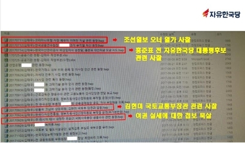 또 '한국자산관리공사 비상임이사 송창달, 홍준표 대선자금 모금 시도'(2017년 7월14일), '코리아나호텔 사장 배우자 이미란 자살 관련 동향'(2017년 7월11일), '방통위 고삼석 상임위원 김현미 국토부 장관과 갈등'(2017년 9월22일)이라는 제목의 한글 파일도 있었다.