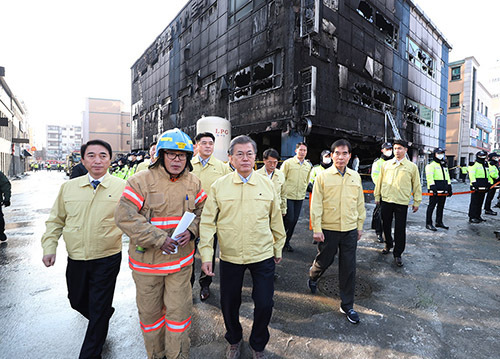 | 현행법상 재난 관련 최상위법에 청와대 역할이 빠져 있고, 국가위기관리센터 관할 분야로 재난이 제외되어 있어 통합적 재난안전관리에 걸림돌이 될 수 있다는 지적이 나온다. 사진은 지난해 12월22일 문재인 대통령이 제천 스포츠센터 화재 현장을 방문한 모습. 세계일보 자료사진 |