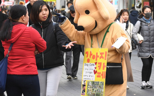 강아지 인형 옷을 입은 아르바이트생이 명동을 찾은 관광객들 사이에서 춤을 추며 관심을 모으고 있다. 본업인 카페를 홍보하는 일부터 기념사진도 같이 찍고 길 안내를 하는 등 관광 도우미 역할도 함께 한다. 인형 옷이 답답하겠지만 밝은 모습 그대로 손짓, 몸짓도 흥이 난다. 나름의 사연을 간직하고 있을 터. 쉴 틈 없이 열심히 몸을 움직이는 젊은 친구들을 보고 있으니 꿈을 이루기 위한 열정이 느껴진다. 그대의 더 나은 삶을 위해 파이팅을 보낸다.