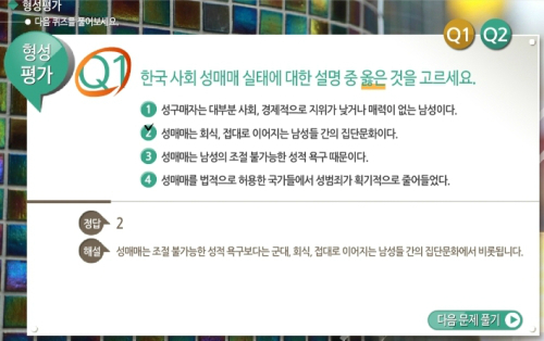 | 국내 한 유명 사립대학교 온라인 성매매 예방 교육 영상 가운데 한국 사회의 성매매 실태를 묻는 문제와 정답, 해설 모습. 남성과 여성을 각각 잠재적인 성범죄 가해자와 피해자로 보는 도식적인 시각에 인권 감수성 강화라는 교육 취지에 고개를 갸우뚱하는 학생이 적지 않다. |