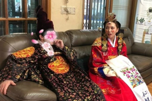 사진 속에는 자택으로 추정 되는 곳에서 문에스더와 분홍 꽃으로 얼굴이 가려진 하재익이 전통 혼례복을 입고 나란히 앉아 있다. 문 에스더의 귀여운 표정에 시선이 간다.