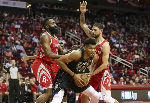 NBA 밀워키 벅스의 야니스 아데토쿤보(가운데)가 휴스턴 로키츠 제임스 하든(왼쪽)의 수비를 뚫고 돌파를 시도하고 있다.