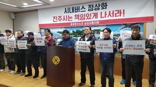 공공운수노조 삼성교통지회는 14일 진주시청 브리핑룸에서 기자회견을 열고 "정부가 정한 최저임금에도 못 미치는 시의 표준운송원가 재산정을 지난해부터 요구했으나 시가 차일피일 미루면서 해를 넘겼다"며 "이로 인해 설을 앞두고 지난 한 달 치 임금이 체불됐다"고 비판했다.