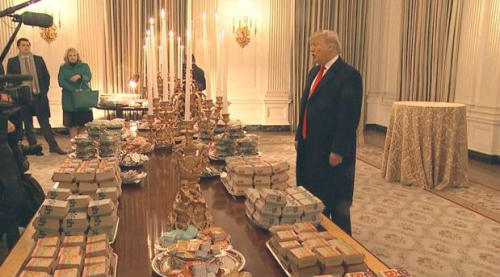 보통 백악관에서 열리는 파티에는 산해진미가 차려진다. 그러나 이날 파티에는 이례적으로 세계적 햄버거 프랜차이즈인 M사와 B사의 햄버거를 비롯해 피자, 감자튀김 등이 식탁 위에 올랐다.