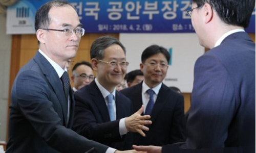 | 지난해 4월 열린 전국 공안부장검사 회의에서 문무일 검찰총장(왼쪽)이 참석자들과 인사하고 있다. 연합뉴스 |