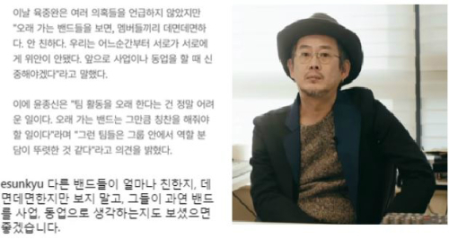 반면 이선규는 해체 없이 오랜 기간 활동 중인 다른 밴드들을 ‘데면데면 하다’고 평가하고, 밴드 활동을 ‘사업, 동업’ 등으로 칭한 것에 불편한 심경을 드러낸 것으로 보인다.