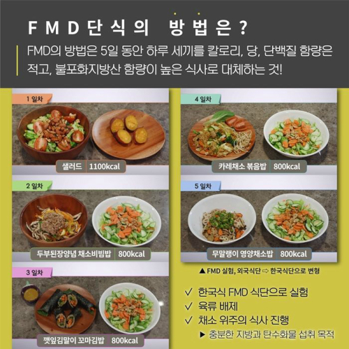 FMD란 '단식모방식단'으로, 한 달에 5일 동안 칼로리(하루 800~1100kcal)를 조절해서 식사를 하는 방법을 일컫는다.