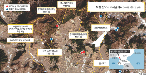 | 미국의 싱크탱크 전략국제문제연구소(CSIS)가 21일(현지시간) 보고서를 통해 공개한 북한 신오리 미사일 기지 위성사진. 이 사진은 지난해 12월 촬영된 것으로 미사일 관련 지하시설이나 벙커, 미사일 운반차량 보관소로 추정되는 시설이 다수 있다고 CSIS는 추정했다. CSIS 보고서 캡처 |