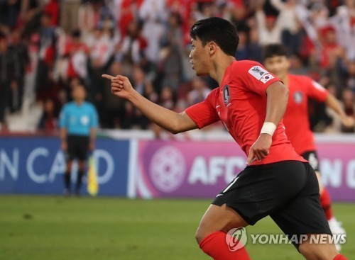 | 22일 오후(현지시간) 아랍에미리트 두바이 라시드 스타디움에서 열린 2019 아시아축구연맹(AFC) 아시안컵 한국과 바레인의 16강전에서 전반 황희찬이 첫골을 득점한 뒤 기뻐하고 있다. |