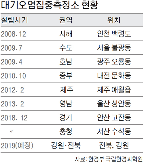 대기오염집중측정소는 지방자치단체가 장비를 설치해 무인으로 운영 중인 대기오염측정소와 달리 환경부 국립환경과학원이 설치하고 전문 연구원들을 상주시켜 운영한다. 현재 인천 백령도 등 전국 6곳에서 운영 중이며, 지난해 경기도 안산(경기권)과 충남 서산(충청권)을 추가해 8곳으로 늘린 데 이어 올해는 전북권과 강원권으로 확대한다.
