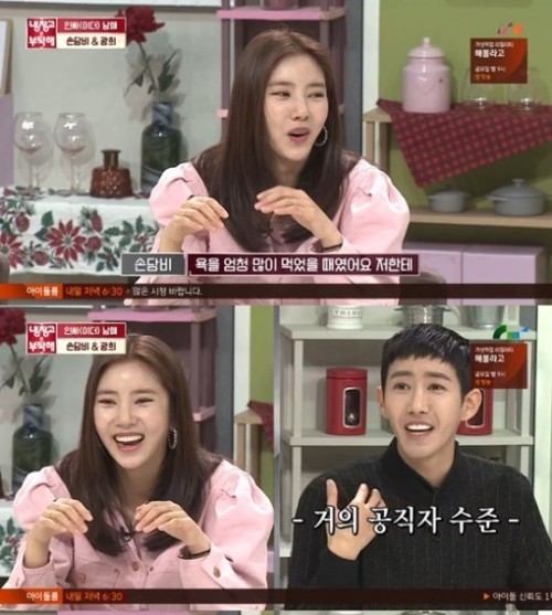 이날 손담비는 광희에 대해 "안지는 6~7년 정도 됐다. 광희는 좀 여린 편이고 제가 부르면 즉각 달려오는 애다. 빼는 애가 아니다”라며 "그런데 '무한도전' 때는 너무 몸을 사리더라. 이미지 관리를 너무 했다. 우리는 만나주지도 않고 유재석 오빠만 찬양 하더라”고 폭로해 웃음을 자아냈다.