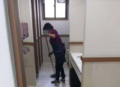 | 서울의 한 기업체 남성 화장실을 여성 청소부가 청소를 하고 있다. 김기환 유통전문기자 |