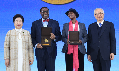 | 한학자 세계평화통일가정연합 총재가 9일 서울 송파구 롯데호텔월드에서 열린 제3회 선학평화상 시상식에서 수상자 등과 함께 기념촬영을 하고 있다. 왼쪽부터 한 총재, 선학평화상 수상자인 아킨우미 아데시나 아프리카개발은행(AfDB) 총재와 와리스 디리, 선학평화상위원회 홍일식 위원장. 이제원 기자 |