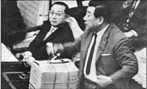 1966년 9월 22일 재벌밀수를 따지면서 정일권 총리(왼쪽)을 향해 인분을 던지고 있는는 김두한 의원. 국회도서관
