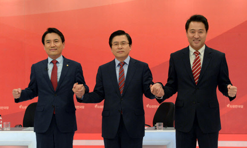 자유한국당 2.27 전당대회를 앞둔 김진태(왼쪽부터), 황교안, 오세훈 당 대표 후보자가 지난 21일 오후 서울 영등포구 여의도 KBS에서 열린 자유한국당 합동TV 토론회에서 손을 맞잡고 있다. 2019.2.22 [국회사진기자단]